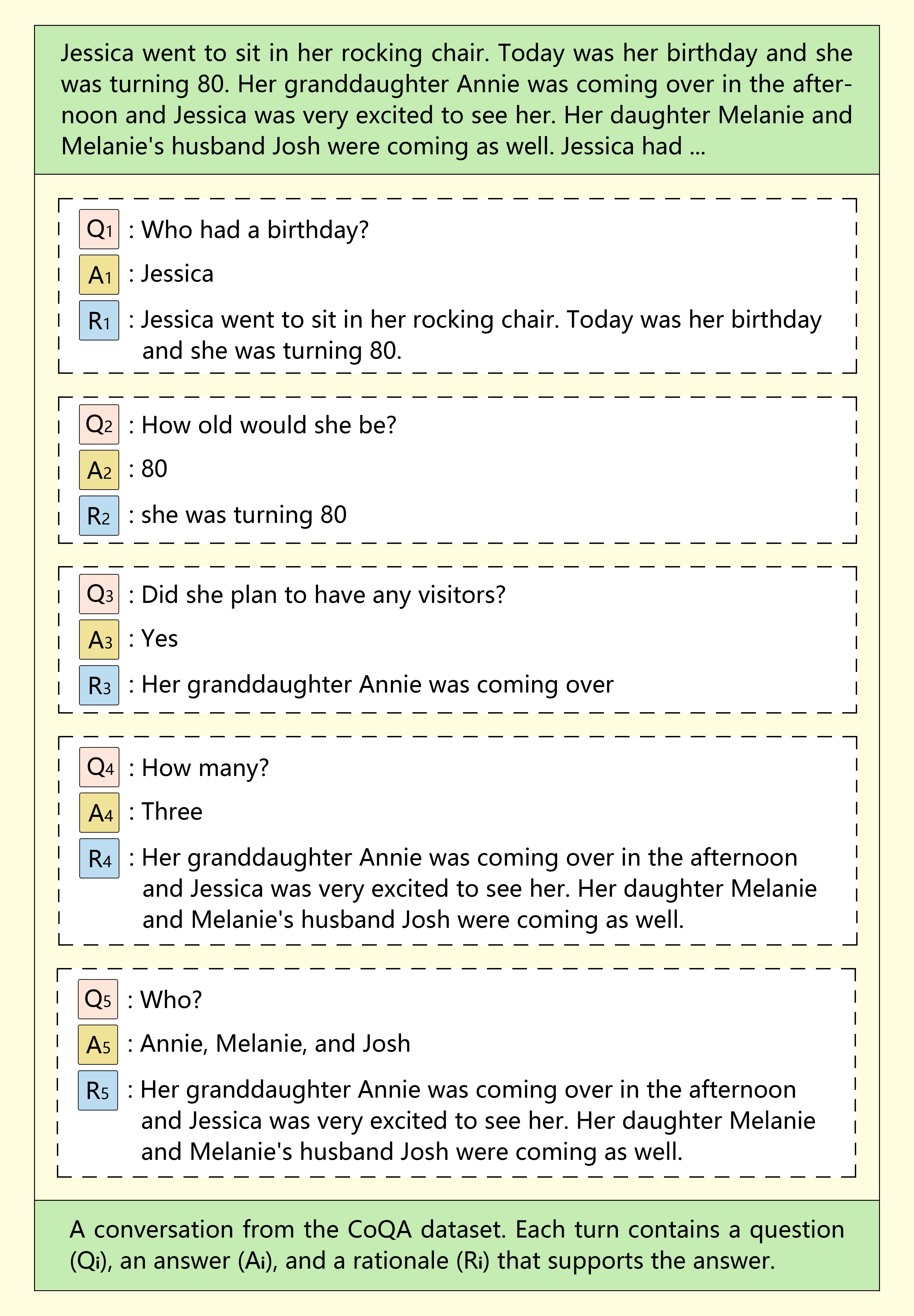 The questions in CoQA are very short, to mimic human conversation. In addition, every question after the first is dependent on the conversational history, which makes the short questions even more difficult for machines to parse. For example, suppose you asked a system, “Who is the founder of Microsoft?” You need it to understand that you were still speaking on the same subject when you ask the follow-up question, “When was he born?”